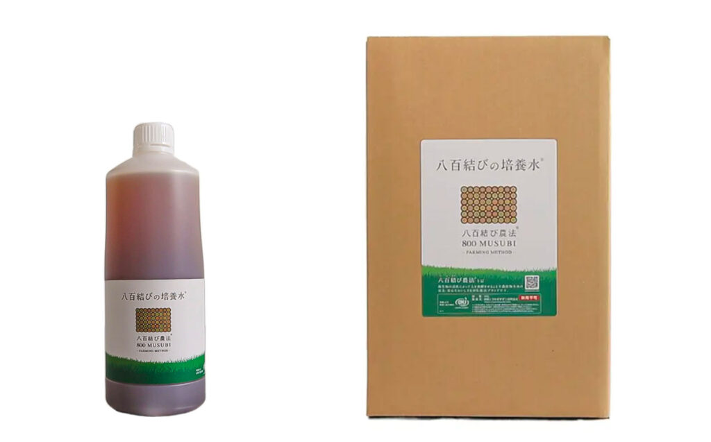 「八百結びの培養水®」は、独自製法(特許取得)純国産バイオスティミュラントによる微生物活性をベースとした「天然資材の培養水」です。葉面散布することで微生物の活性を促します。また、土壌に滴ることで土着微生物を活性させる土壌改良資材としても有効です。